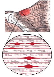 When a muscle is contracted for a long period of time (sleeping, driving, performing the same repetitive motions) the muscle will develop Trigger Points. Trigger Points are firm, palpable, highly irritable spots in a taught (tight) band of muscle fiber or fascia, characterized by exquisite tenderness, referred pain, and loss of range of motion. More Commonly referred to as "Knots" in the muscle. These cause shortness of the muscle, putting tension on its attachments to the bone.